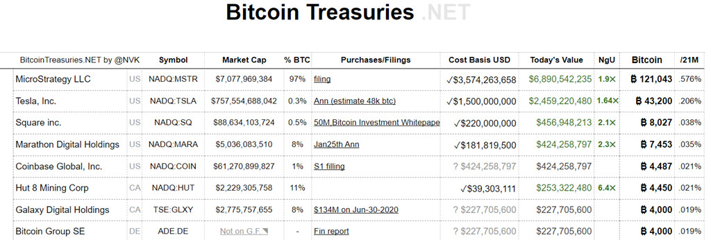 据监测上市公司比特币持仓量的Bitcointreasuries.net数据显示,Microstrategy目前已持有12万1,044枚BTC(换算价值约68.99亿美元,占该公司市值达惊人的97%),平均购入价格为每枚比特币29,534美元,稳坐上市公司BTC持币霸主,大幅领先后面的Tesla(0.3%)、Square(现Block,0.5%)及Marathon Digital Holdings(8%)。