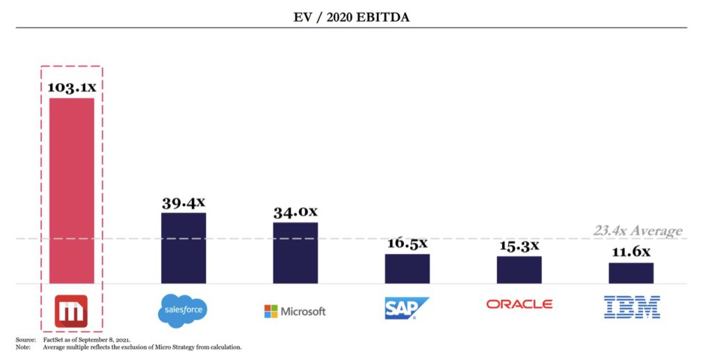还有一个争论的核心是MicroStrategy目前的股价,以常用的企业估值EV/EBIT比率来看,MicroStrategy目前的股价是103倍,远高于相同行业属性的Salesforce、微软、SAP、甲骨文和IBM。