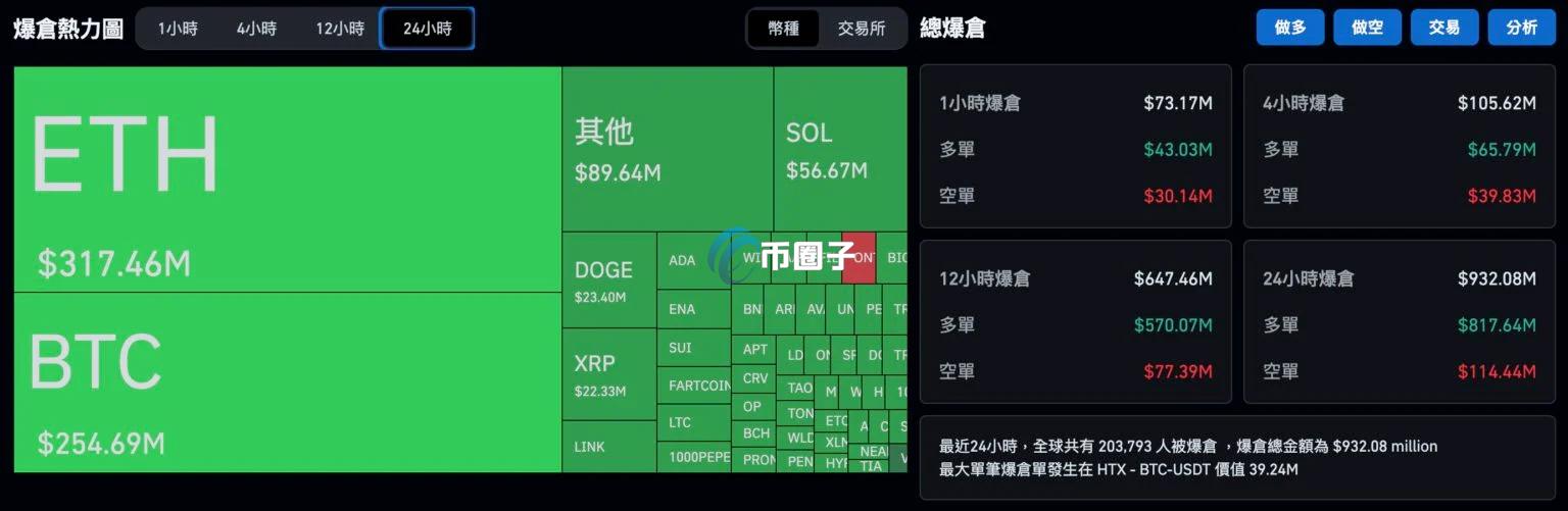 根据Coinglass数据,剧烈的波动导致全网爆仓9.3亿美元,超20万人遭清算。其中ETH多单爆仓3.17亿美元,占最大宗。