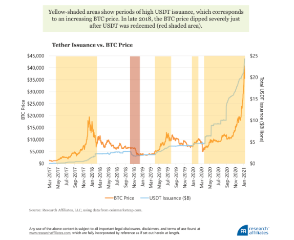 《彭博社》(Bloomberg)在2018年即发布报告指出,USDT似乎被用来操纵比特币价格;今(15)日稍早《彭博社》再发布文章,内容引用定量研究公司Research Affiliates研究报告,警告市场可能受到操控,称比特币的价格受到Tether欺诈性交易影响。