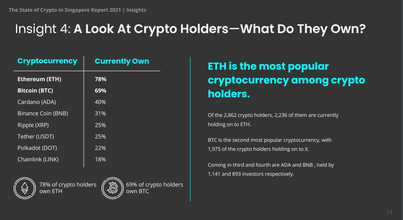 值得注意的是,在加密货币持有者当中,持有以太币(ETH)的比例高达78%,高于持有比特币(BTC)比例的69%,另有40%的比例持有Cardano(ADA),31%的比例持有币安币(BNB)。