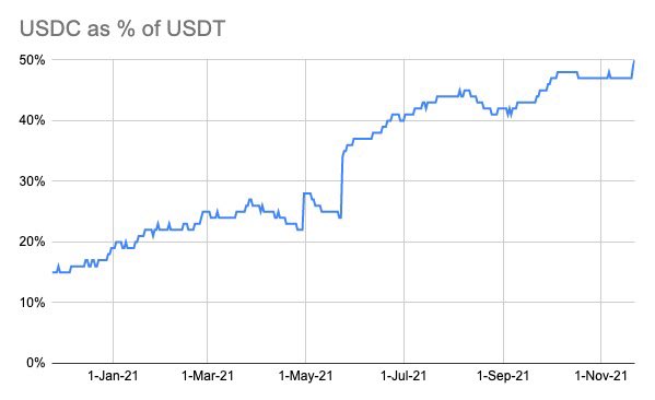 稳定币USDC发行商Circle的创办人兼CEO阿莱尔(Jeremy Allaire)11月23日在推特上宣布,USDC相对市场龙头USDT的占比,已经突破50%,由于市场流通及交易量上USDT依旧大胜,显见USDC的成长,可能源于中心化交易所以外的需求。