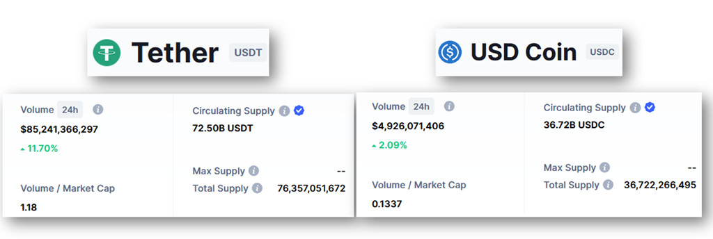 根据Coinmarketcap资料显示,USDT目前的总供应量约为763.57亿美元、USDC则为367.22亿美元,确实呈现50%的表现。然而若从24小时交易量来看,USDT仍以852.41亿美元大幅领先USDC的49.26亿美元,显见USDC的成长动能或许源于去中心化交易所、DeFi协议等场域。